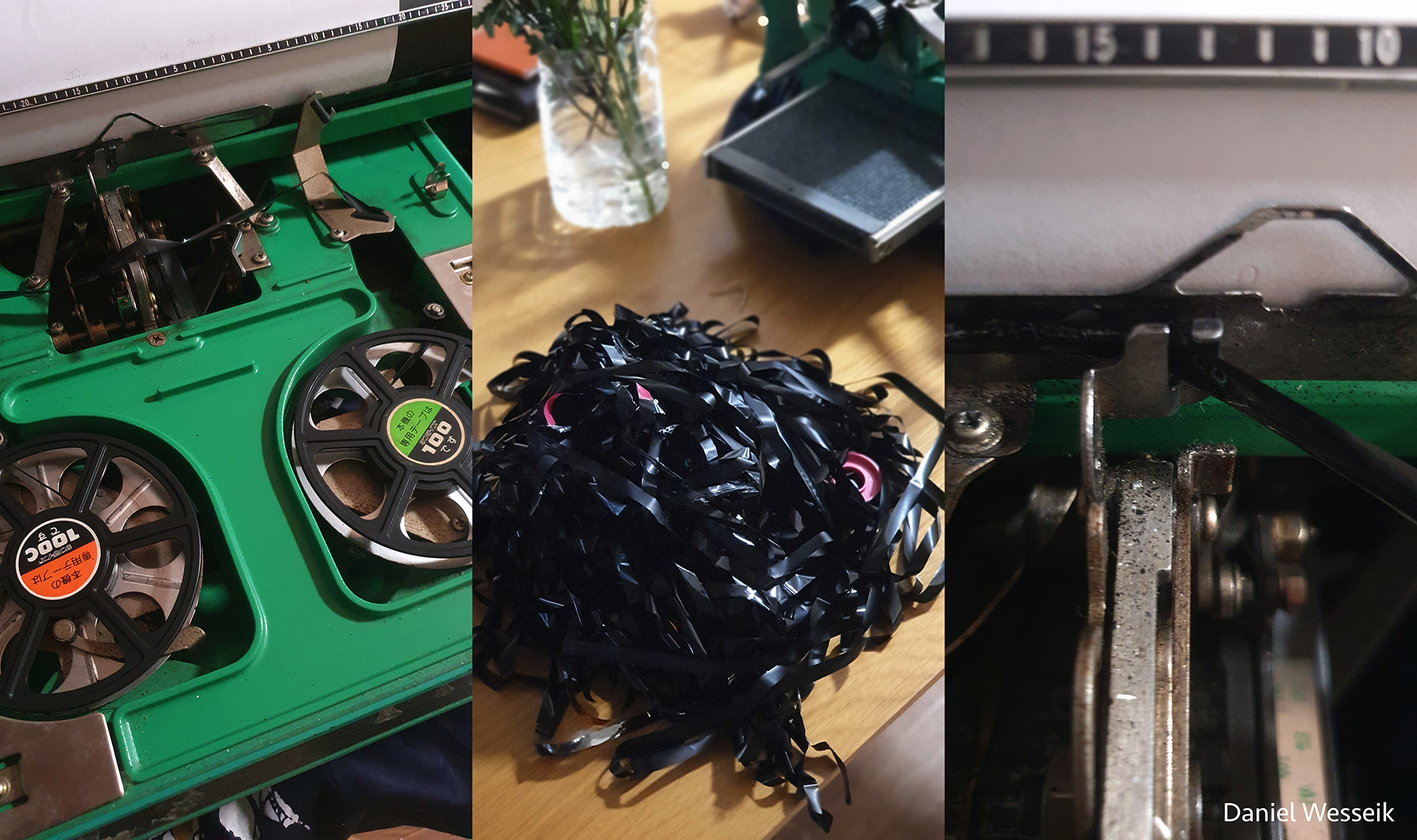 I had already started to recalculate my plan and look for alternatives, when one day, after presenting our work at the university, I was called to the office and there, next to the window, a green, huge, beautiful Japanese typewriter was waiting. I am so very thankful to Shizuka for the surprise and arrangement and also to her colleague who had heard me talk about my wish to obtain a typemachine in one of the talks.