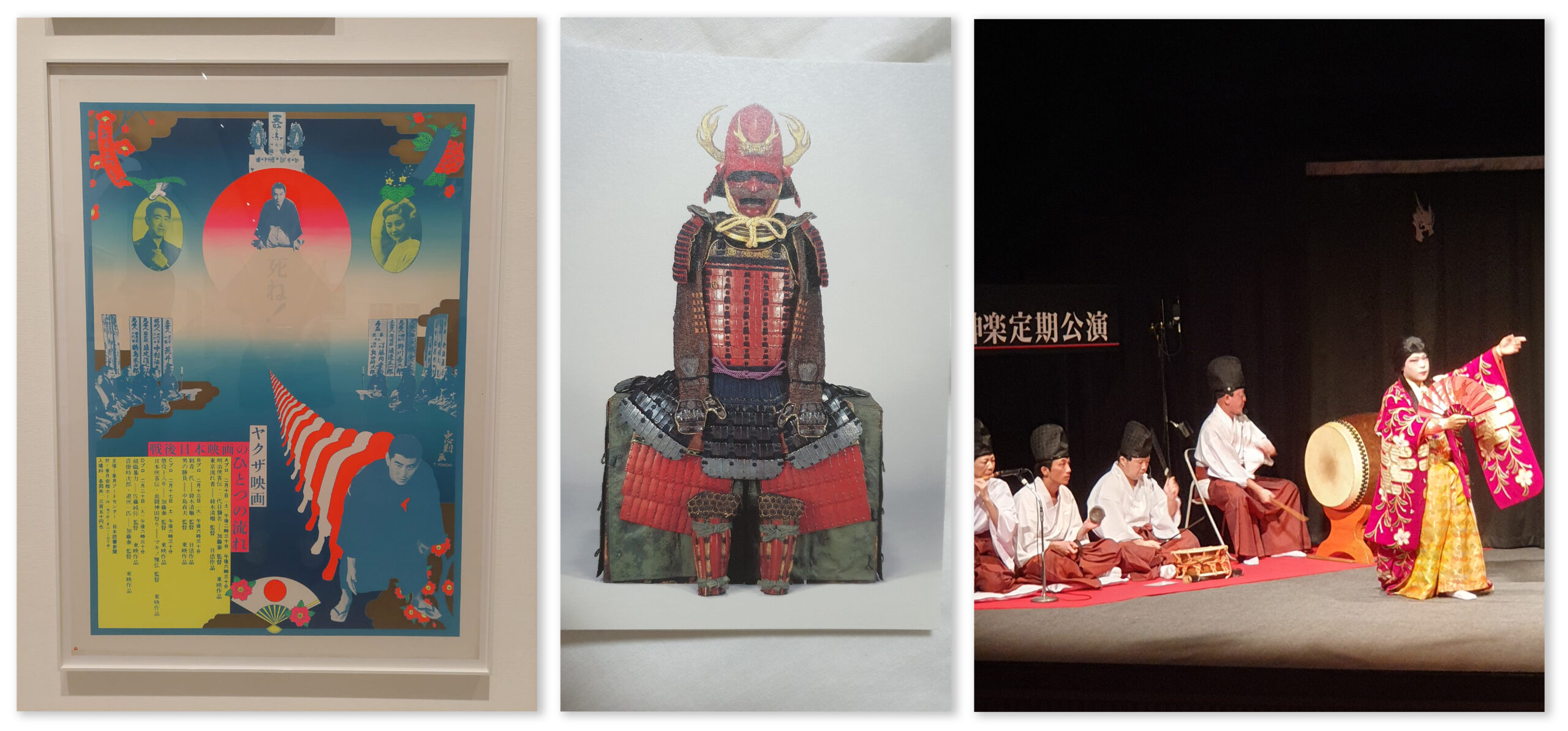 キャプション:インスピレーション(横尾忠則のポスター、サントリー美術館の工芸品、広島の神楽公演)