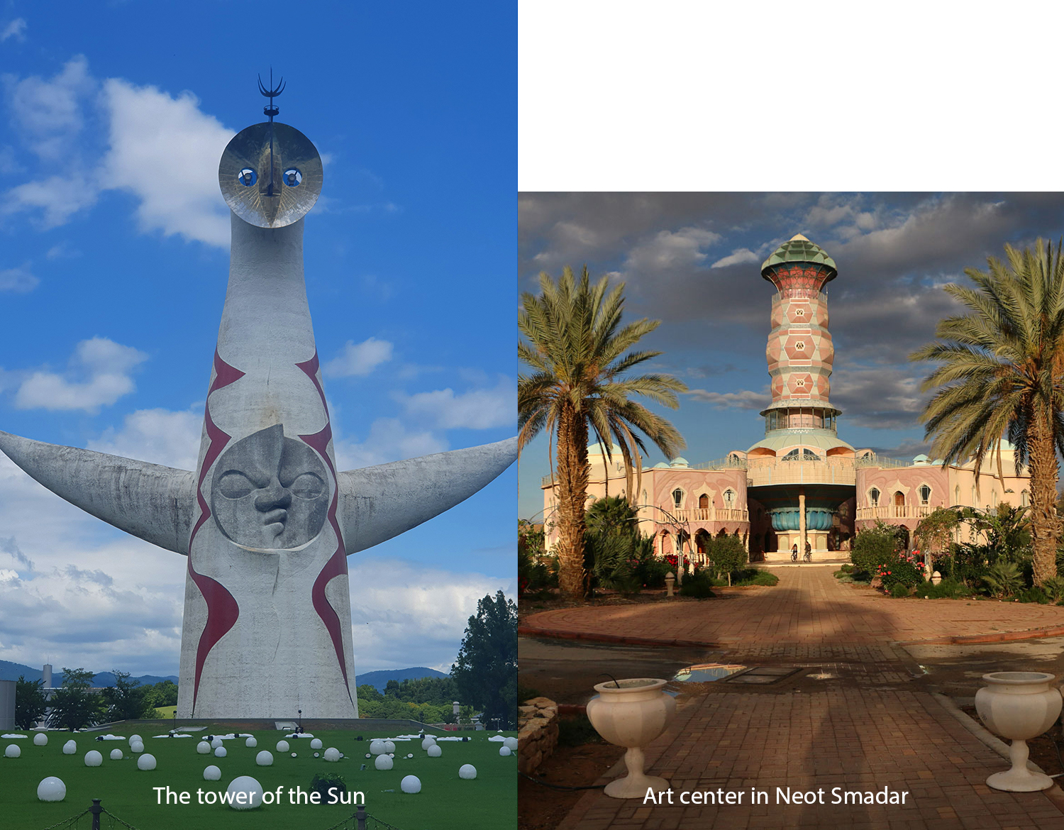 この期間中の最も記憶に残る訪問の一つは、スジンの推薦で訪れた「太陽の塔」でした。この大阪近郊にある巨大なアートプロジェクトは、高い塔の構造とその内部にある博物館が特徴です。コロナ禍の前にイスラエル南部のキブツでボランティアとして働いていたアートセンターを思い出しました。太陽の塔が豊かな緑の木々の中に堂々と立つ一方で、アートセンターは砂丘の中に誇り高く立っていました。
