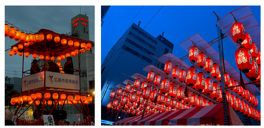 広島に到着してすぐ、とても大きな祭りが開催されました。赤い提灯が雨に濡れた街に美しく映え、幻想的な雰囲気を醸し出していました。祭りの真ん中では、みんなが音楽に合わせて踊っていましたが、私は恥ずかしくて参加できず、後ろで一生懸命手拍子をしていました。カラフルでかわいい浴衣を着ている人がたくさんいて、とても素敵だったので、いつか私も浴衣を着てみたいです。
