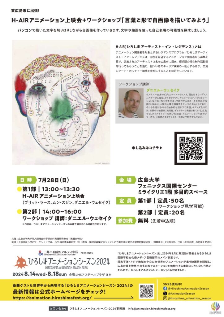 アニメーション上映会は、H-AIR招聘作家3名(ブリット・ラース、ムン・スジン、ダニエル・ウェセイク)が制作したアニメーションを上映。ワークショップは、ダニエル・ウェセイクを講師に招き、パソコンで描いた文字を切りはりしながら自画像を作っていきます。文字や絵画を使った自己表現の可能性を探求していくワークショップです(作品は、ひろしまアニメーションシーズンの本番で展示される可能性があります)。